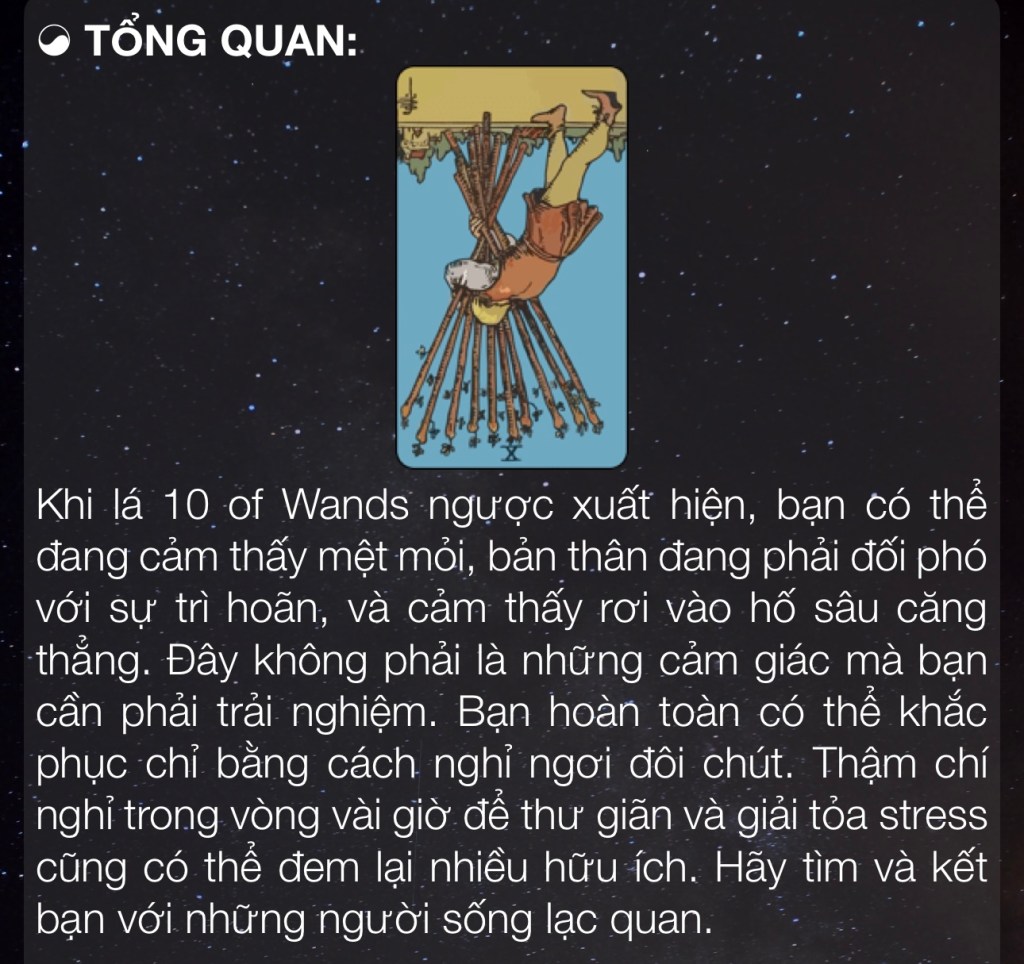 When the 10 of Wands reversed appears, you may be feeling tired, dealing with procrastination, and feeling stressed. These are not feelings you need to experience. You can overcome them by taking a break. Even taking a few hours off to relax and de-stress can be helpful. Seek out and surround yourself with positive people.