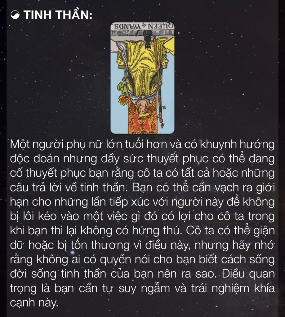 An older woman who tends to be domineering but persuasive may try to convince you that she has all or some of the answers when it comes to spirituality. You may need to set boundaries with this person so that you don’t get pulled into something that benefits her and is not your interest. She may be angry or hurt by this, but remember that no one has the right to tell you how to live your spirituality. It is important that you reflect and experience this aspect of yourself.